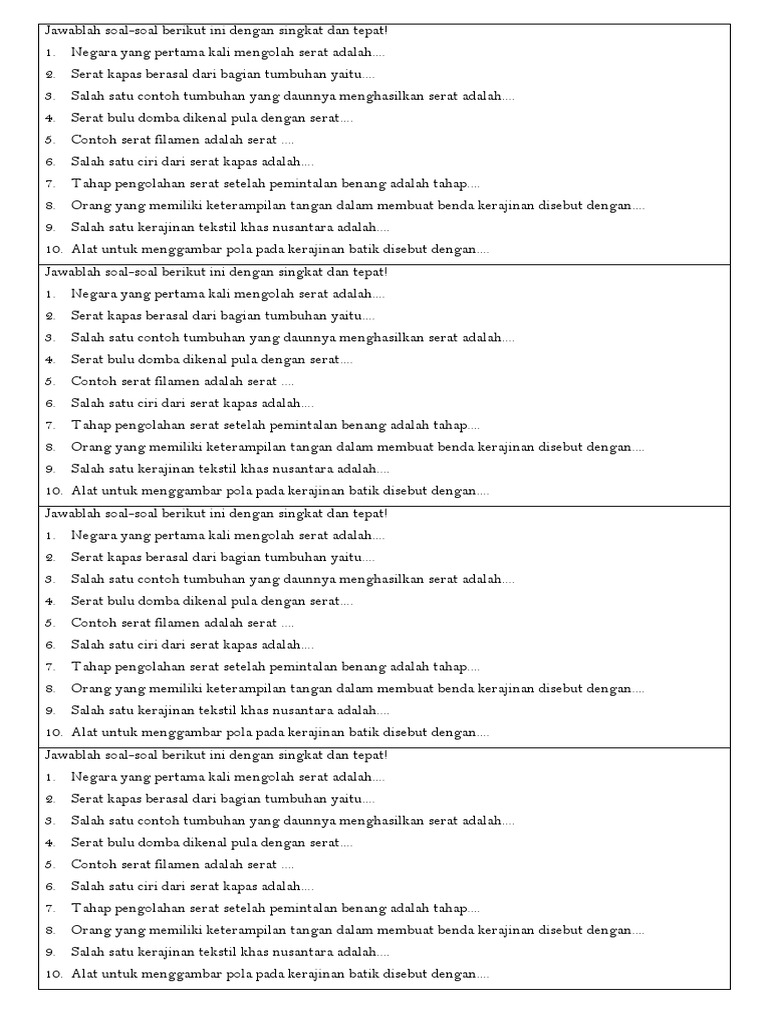 Contoh soal pg prakarya kelas 7 semester 1 beserta jawaban kurikulum 2013 smpmtsbagian2 halo selamat datang kembali di blog soal soal sekolah postingan bagian ke 2 merupakan lanjutan bagian ke 1 soal nomor 1 10 dengan materi yang sama yaitu soal tentang kerajinan dan tekstil. Karena biasanya soal ujian prakarya kelas 7 semester 1 yang akan diujikan tidak jauh berbeda dengan soal tahun sebelumnya. Soal Ulangan Harian Prakarya Kelas 7 Bab 1 Pengolahan Serat August 29 2020 Assalamualaikum wr.